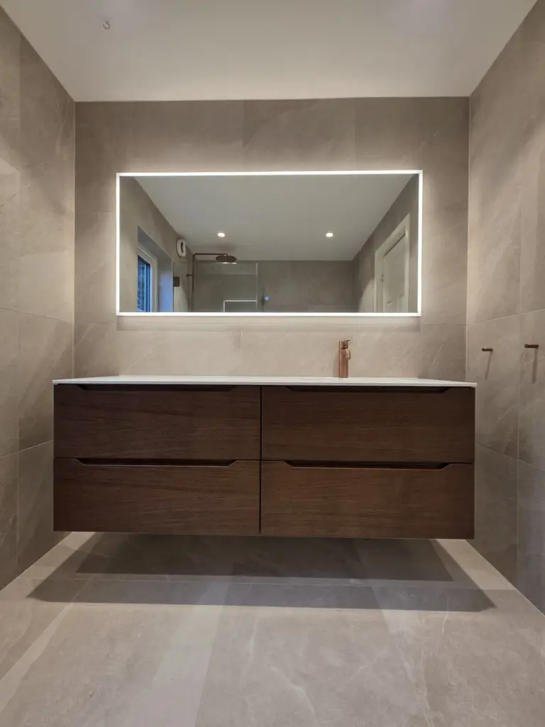 Resultatet er et bad som oppleves både moderne og lunt, med gode flater, praktiske løsninger og en behagelig atmosfære. Et rom det er lett å trives i – og som vil holde seg vakkert i mange år fremover.
